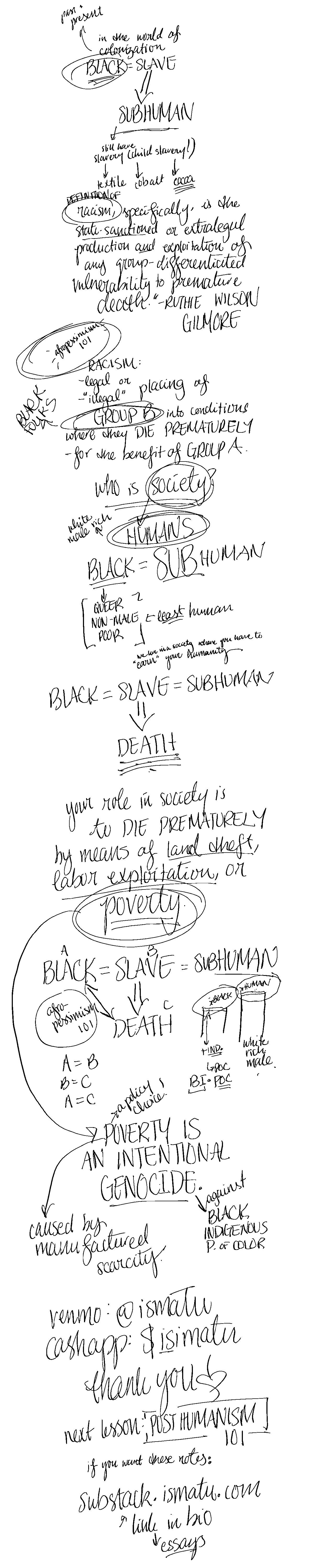 secondly, it’s really because I meant to send these notes out days ago. if you haven’t been keeping up with me on socials, neither have I! lol. I’ve been doing lives on Saturday nights where we talk politics. last time I gave a mini lecture about afro-pessimism 101, and lots of folks requested the notes! here they are as a jpeg at the bottom of this email.