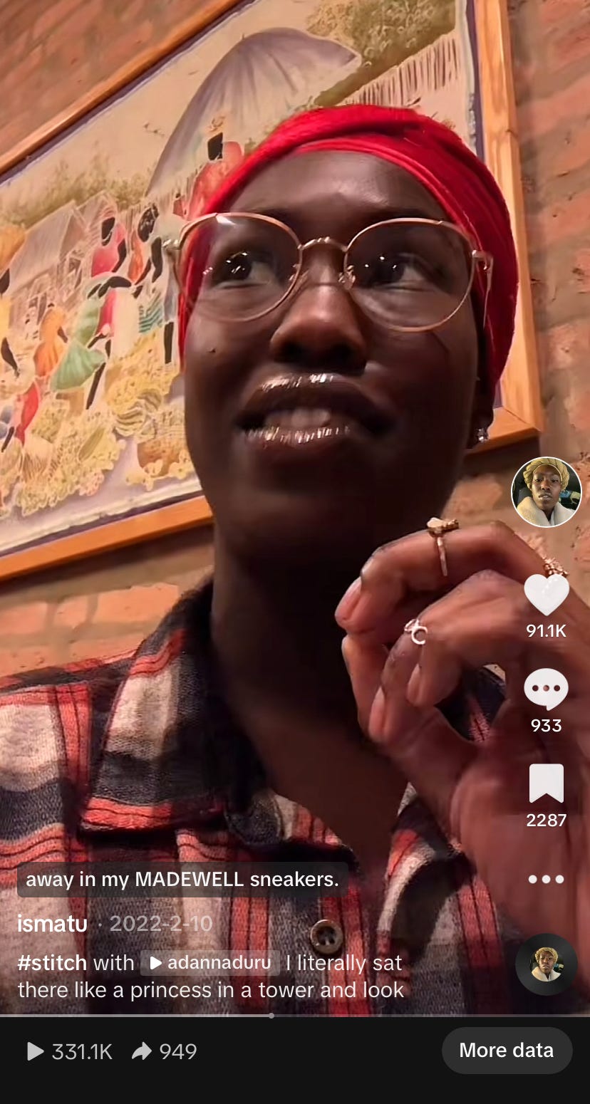 My name is Ismatu Gwendolyn and I am committed to learning and feeling through the sticky nature of human connection— the study of love, or the lack thereof. In this world, love means liberation. I have scholastic dedication to African-American studies, global health, clinical social work and poetry, and I have academic histories and roots at Northwestern University and The University of Chicago in the United States of America (in and around Chicago, IL). I am a Sierra Leonean Black US-American personally and generationally from the mountains. I am an information anarchist and I act on that politic by learning, growing, and sharing what I learn, both on my TikTok and Instagram where I do personal + political education, and most especially here with you all, in the essays. All of this, along with my work as a mental health professional, is and will remain free of charge. As of writing this, I am 25 years old.