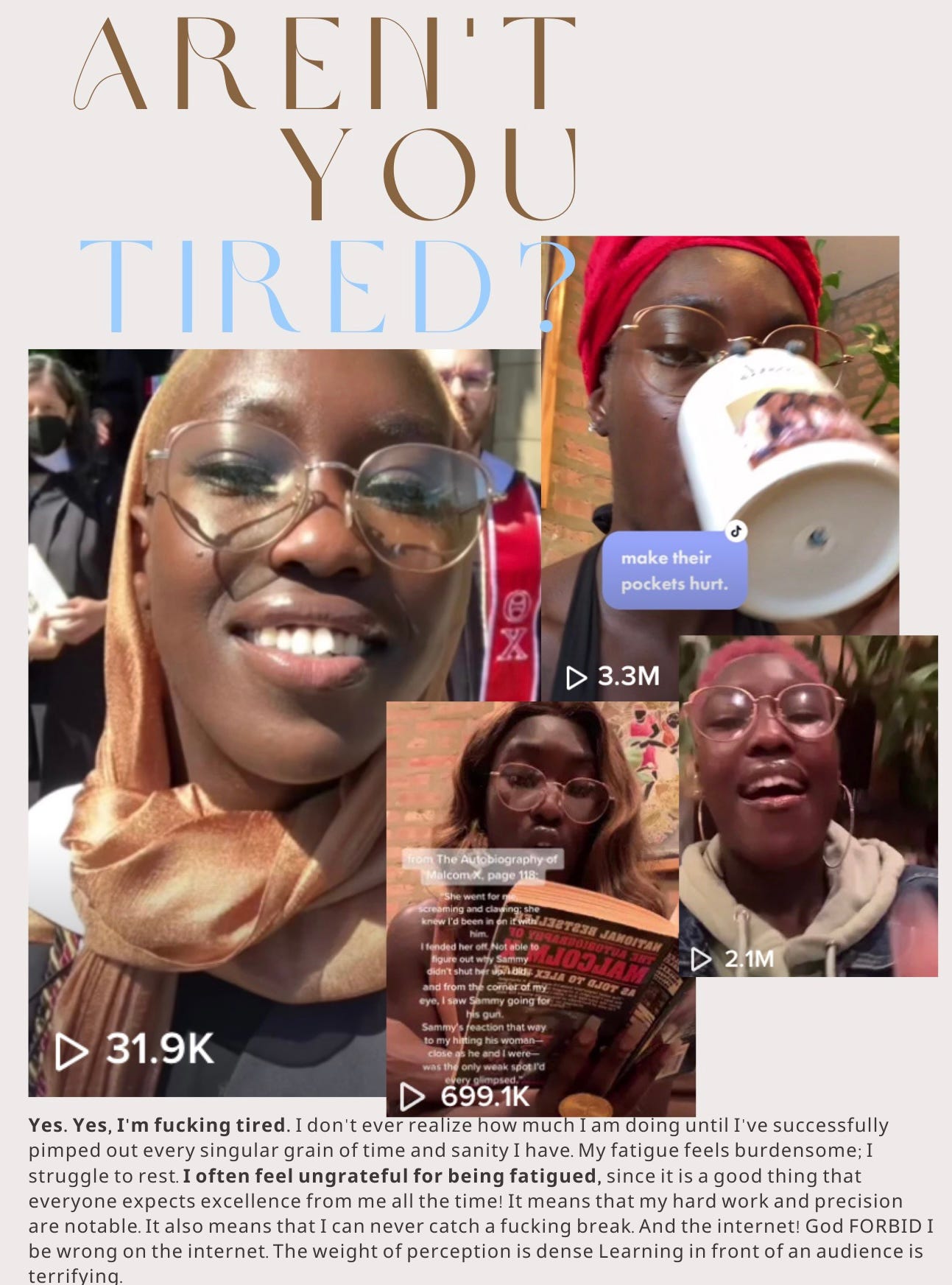 The process of becoming in real time is something that so few people get access to, especially because I have access to it in a way that doesn't require me to go through “official channels.” It doesn't require me to censor myself for the TikTok overseers. It doesn't require me to submit myself to an editor to be distributed at some big body press. I can just talk to you, and you can listen to me, and you can talk back to me, and that's so special. In fact, this is a temporal space that won't last forever.